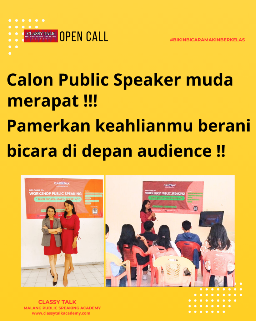 Classy Talk Malang Public Speaking Academy membuka panggilan terbuka untuk sekolah, kampus, komunitas dan perusahaan yang ingin upgrade ketrampilan berbicara. Program ini bersifat kolaborasi (free) bagi institusi yang mendaftar sepanjang bulan Januari 2025. So, tunggu apalagi segera daftarkan karena slot terbatas !!!