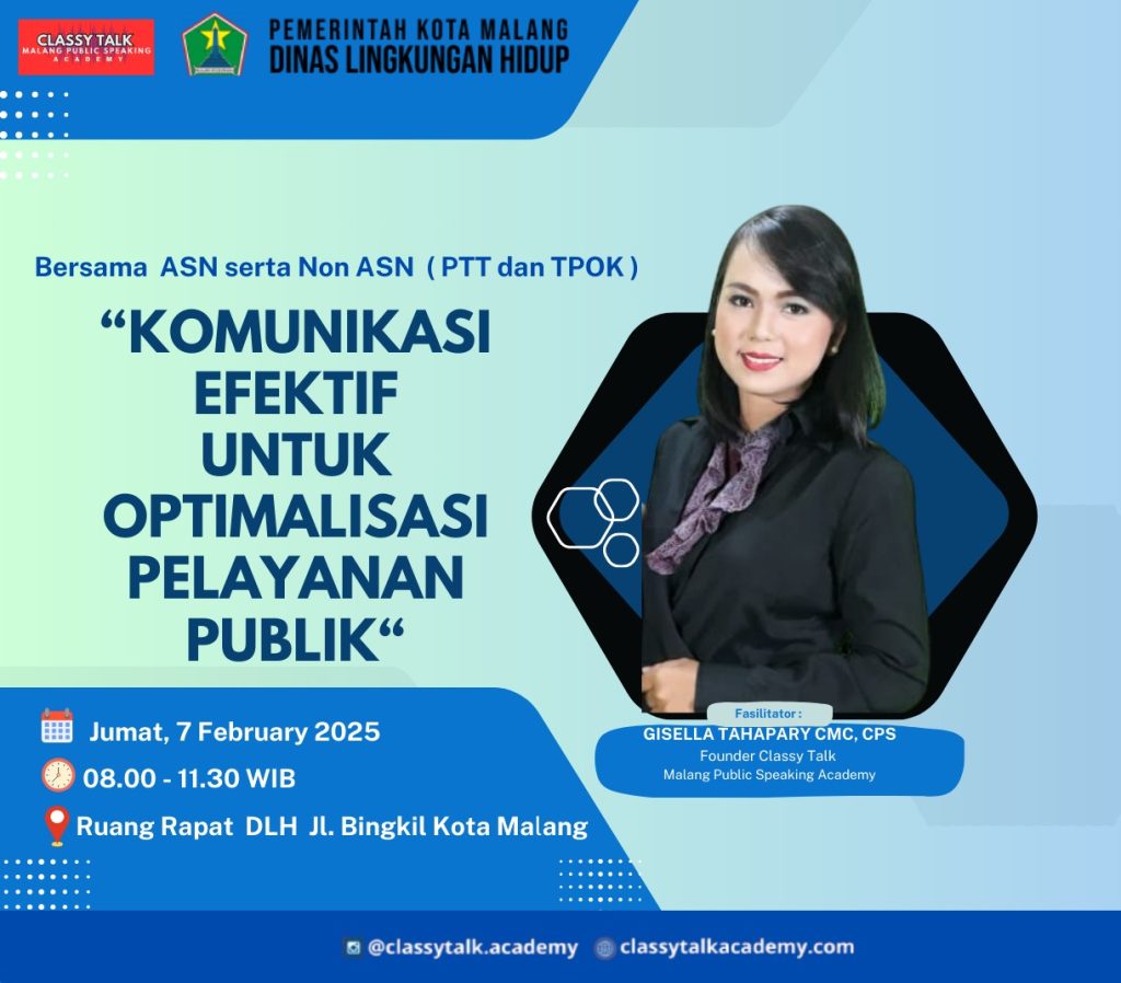 Pada Jumat, 7 Februari 2025 Classy Talk Malang Public Speaking (CTMPS) Academy bekerjasama dengan Dinas Lingkungan Hidup (DLH) Kota Malang beri pelatihan Public Speaking “Komunikasi Efektif Untuk Optimalisasi Pelayanan Publik”. Sebagai bagian dari komitmen DLH untuk terus mewujudkan layanan publik yang berkualitas lewat inovasi-inovasi yang diterapkan seperti mulai dari area lingkungan hidup terpadu hingga ke […]