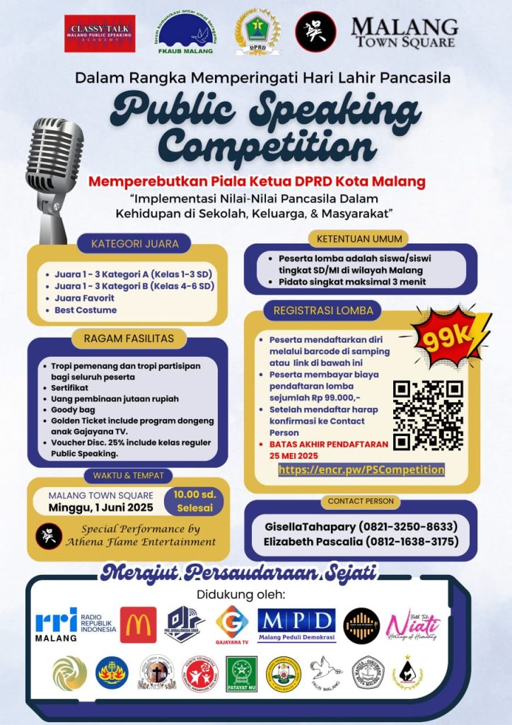 MALANG, (22/05/2025) – Dalam rangka memperingati Hari lahir Pancasila yang jatuh setiap tanggal 1 Juni, Forum Komunikasi Antar Umat Beragama (FKAUB) Malang bekerjasama dengan Classy Talk-Malang Public Speaking Academy (CTMPS) Academy akan menyelenggarakan Lomba Public Speaking tingkat SD dalam bentuk pidato sebagai sarana edukasi sekaligus pengembangan potensi siswa dalam berkomunikasi dan menyampaikan ide-ide positif tentang […]